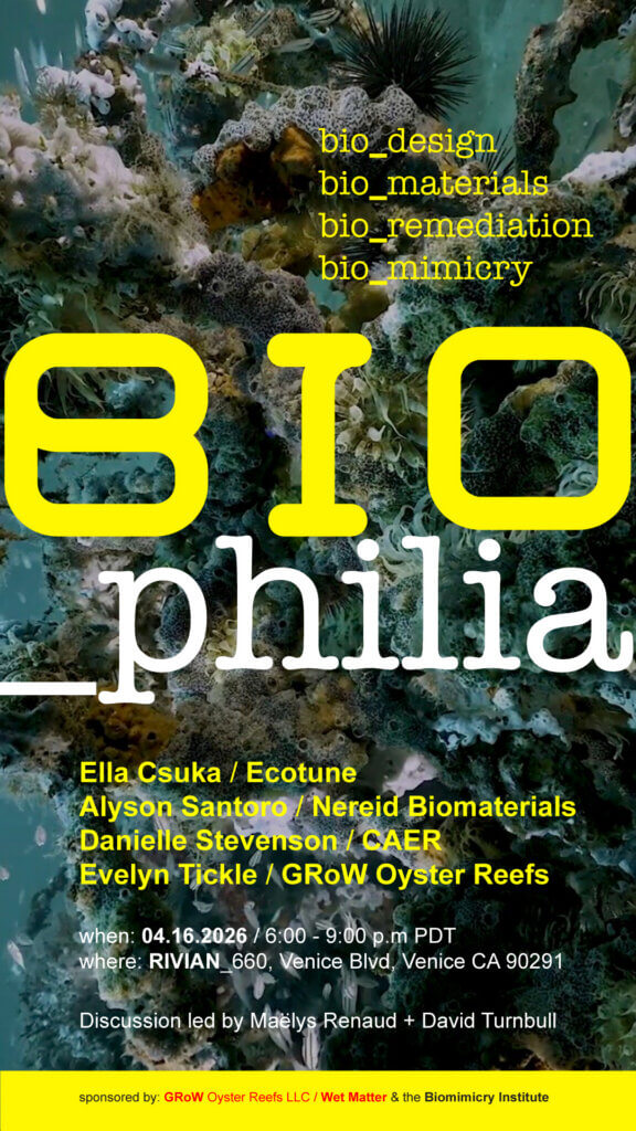 Biophilia is a natural affinity for living systems, a principle, a name for an enduring, profound, kinship with living organisms, a book, published in 1984, by E.O Wilson, a studio album by Björk, released in 2011, a hypothesis, a celebration of abundance and reciprocity, and now, in the context of LA Climate Week 2026, an evening of presentations and discussion that will focus on the extraordinary and exceptional work of four California based start-ups: Ecotune, Nereid Biomaterials, the Centre for Applied Ecological Remediation, CAER, and GRoW Oyster Reefs.