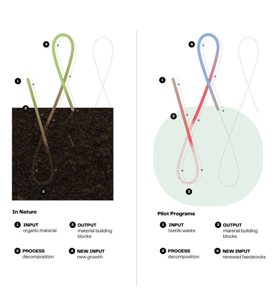 Led by Beneficial Design Institute in partnership with Fraunhofer IAP, matterr GmbH, and Fraunhofer IGB, the pilot tests two complementary pathways inspired by how nature decomposes and rebuilds: