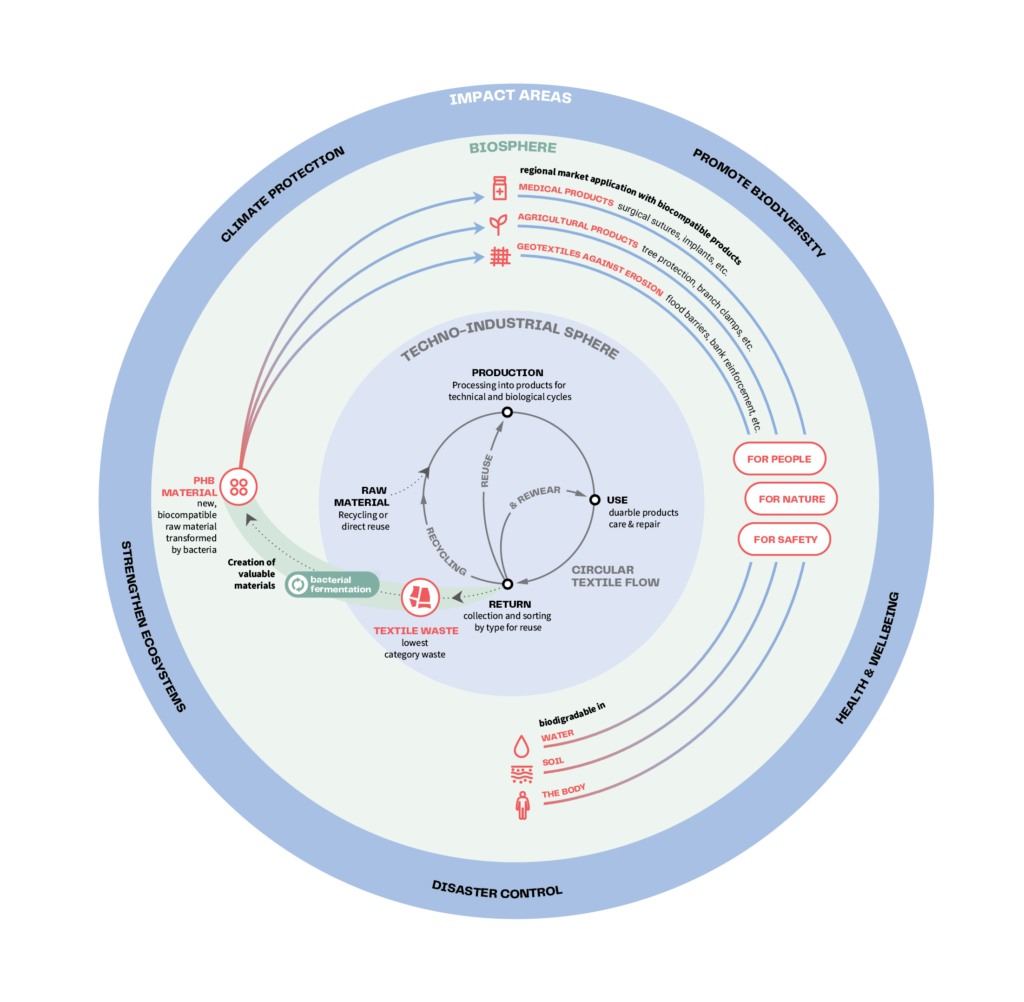 In Berlin-Brandenburg, a surgical team prepares for an operation. The biodegradable sutures they’re using were once a nurse’s uniform. In a nearby greenhouse, plants are thriving with biofertilizers made from contaminated cleaning cloths that have been cleaned and decomposed. Along the coast, erosion-control structures built from this same textile waste protect shorelines while also safely biodegrading over time.