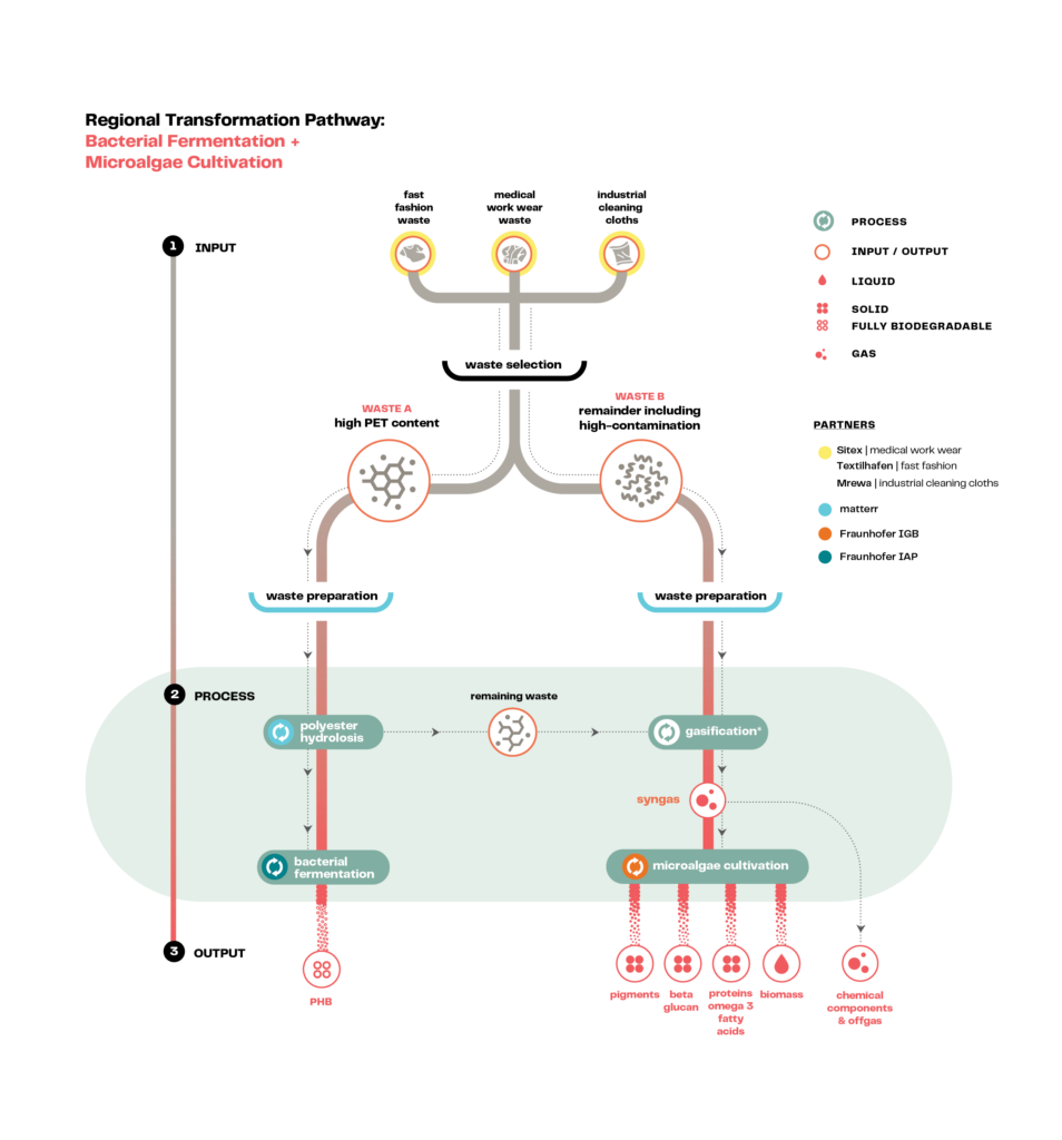 For textiles too mixed or contaminated for the first pathway, a second approach envisions using gasification to convert them into carbon-rich gas. Microalgae then use that gas to grow and produce beta-glucan, a glucose-rich compound valuable for agriculture as biofertilizers and plant stimulants.