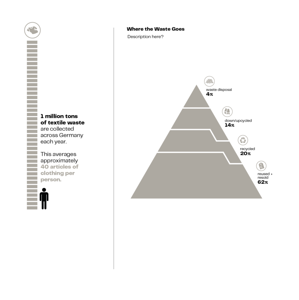 Germany collects approximately 1 million tons of textile waste annually1, yet 54,000 tons2 still burn in incinerators each year. Thousands more get exported to Global South nations, flooding local markets and ecosystems with waste that was “too difficult” for European infrastructure.