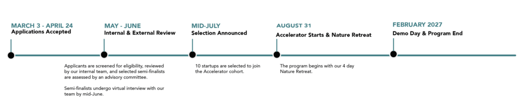This 6-month program runs from August 2026 to February 2027. It is a remote program with the exception of one week of in-person gathering which includes a 4-day immersion in nature in the US (travel expenses and accommodation will be covered). Each week of remote programming will be focused on a specific topic and external experts will be invited to host a lecture, workshop, or a panel discussion. For more information, read visit our Accelerator page.