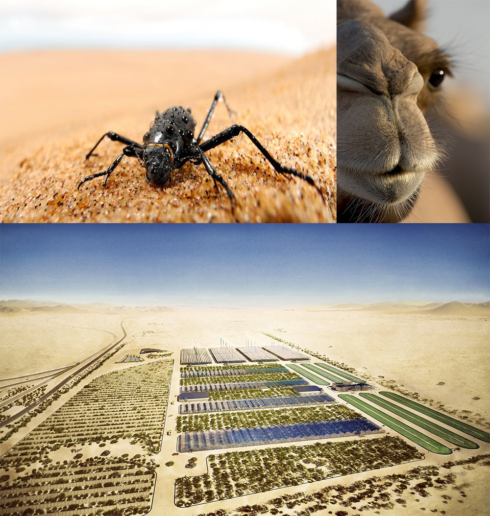 Camel nostrils are damn hard to beat as an atypical source of design inspiration. But these two flaring beauty marks are part of the ingenuity behind turning an infertile desert on the outskirts of a Jordan airport into a fertile greenhouse. As if nostrils weren’t clever enough, they also turned to the Namibian fog-basking beetle for its brilliant adaptation to find fresh water in one of the most inhospitable places on Earth.