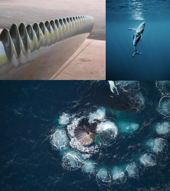 This design shift was a surprise to many engineers, who believed that a smooth leading edge would result in superior efficiency. But experts determined that with bumpy fins, humpbacks can have a steeper angle of attack (the angle between the flow of water and the bumpy edge of the flipper), helping the whale to move effectively. This can be witnessed during their unique “bubble net feeding behavior” when they maneuver in tight circles and herd krill using air bubble clouds that entrap their prey.